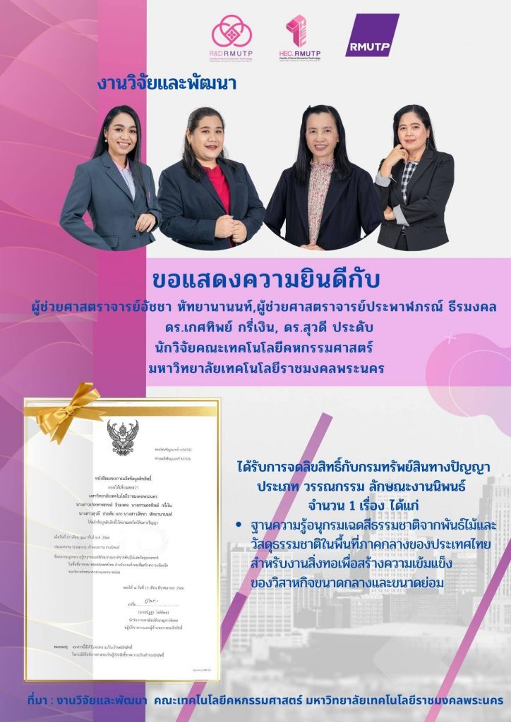 ขอแสดงความยินดีกับอาจารย์ #สาขาวิชาออกแบบแฟชั่นและการจัดการสินค้า ผู้ช่วยศาสตราจารย์สรรษนีย์ เต็มเปี่ยม, ผู้ช่วยศาสตราจารย์ประพาฬภรณ์ ธีรมงคล, ผู้ช่วยศาสตราจารย์ไตรถิกา พิชิตเดช นางสาวณัฐชยา เปียแก้ว และนายเกชา ลาวงษา นักวิจัยคณะเทคโนโลยีคหกรรมศาสตร์ มหาวิทยาลัยเทคโนโลยีราชมงคลพระนคร ได้รับการจดลิขสิทธิ์กับกรมทรัพย์สินทางปัญญาประเภท วรรณกรรม ลักษณะงานนิพนธ์ เรื่อง การพัฒนาผลิตภัณฑ์ผ้าย้อมสีจากแก่นกาสะลอง ที่มา…
