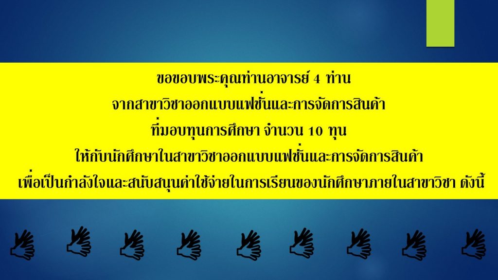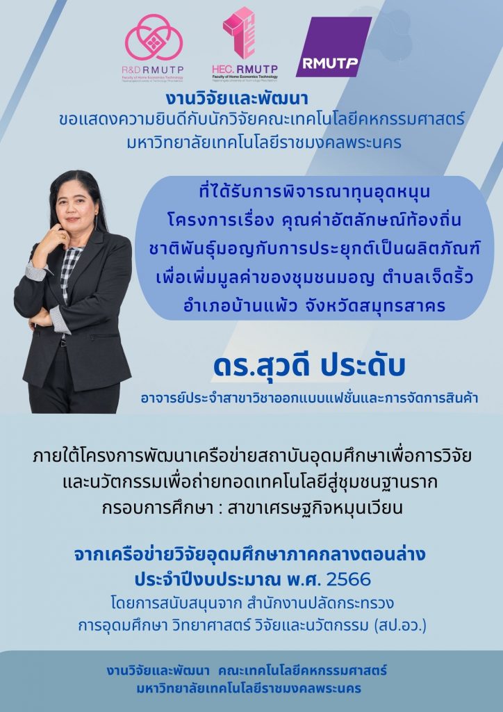 ขอแสดงความยินดีกับ อ.ดร.สุวดี ประดับด้วยนะคะ ที่ได้รับการพิจารณาทุนอุดหนุน โครงการเรื่องคุณค่าอัตลักษณ์ท้องถิ่นชาติพันธ์มอญ กับการประยุกต์ผลิตภัณฑ์ เพื่อเพิ่มมูลค่าผลิตภัณฑ์ของชุมชนมอญ ตำบลเจ็ดริ้ว อำเภอบ้านแพล้ว จังหวัดสมุทรสาคร (ที่มา : งานวิจัยและพัฒนา คณะเทคโนโลยีคหกรรมศาสตร์ มทร.พระนคร)