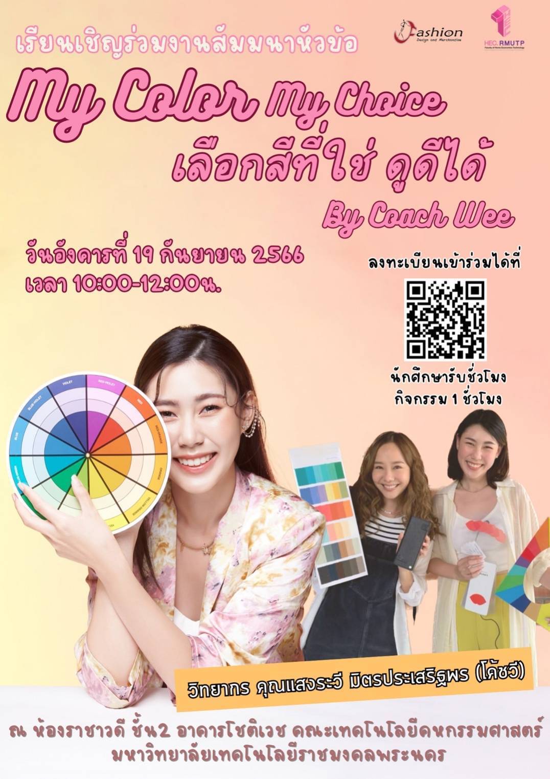 คณะเทคโนโลยีคหกรรมศาสตร์ ได้กำหนดจัดโครงการสัมมนา หัวข้อ “My Color My Choice เลือกสีที่ใช่ ดูดีได้ By Coach Wee”